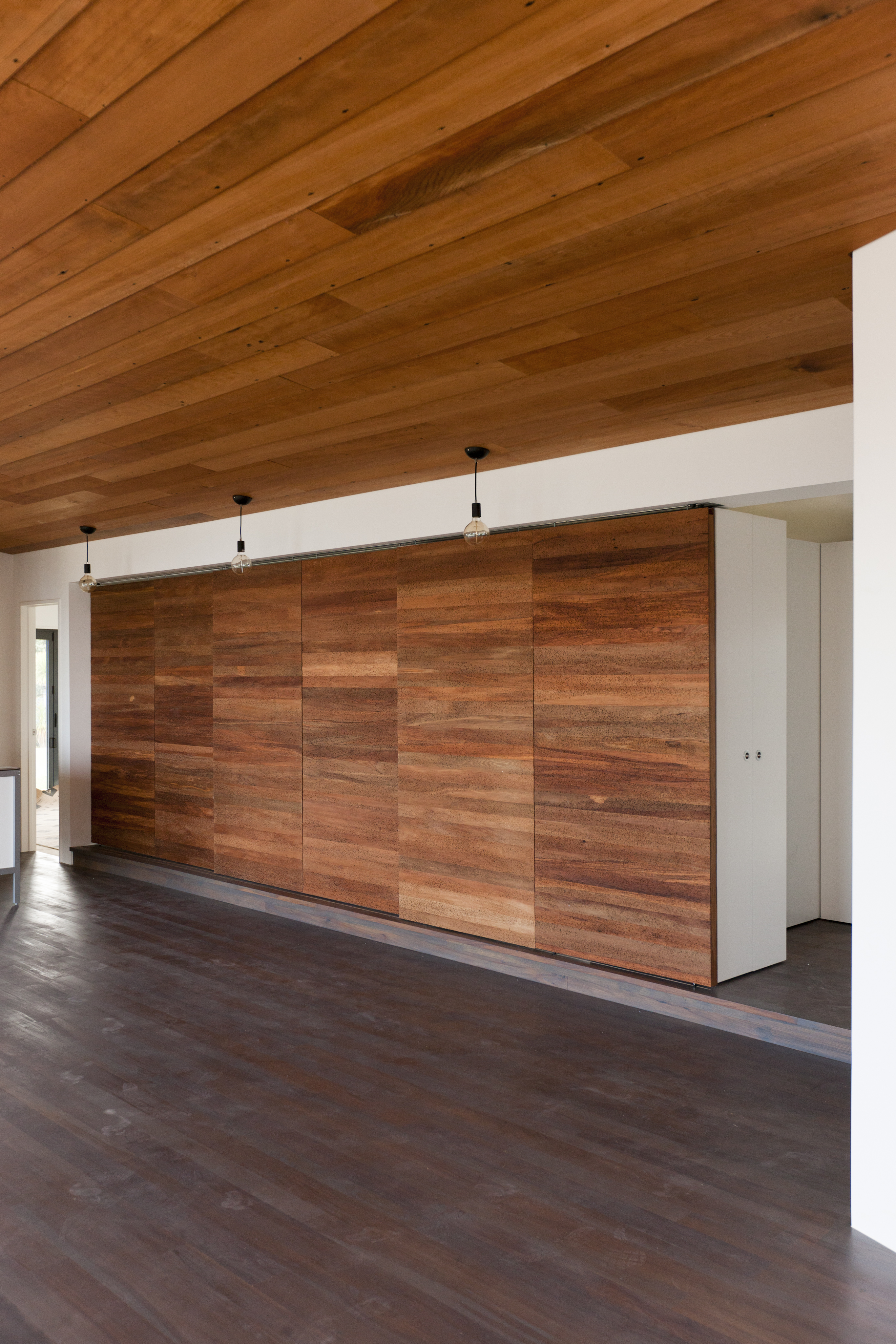 01.Doors for Langs Bach with CNC relief set into re-used rimu match-lining. Photograph: S. Ruthramoorthy.