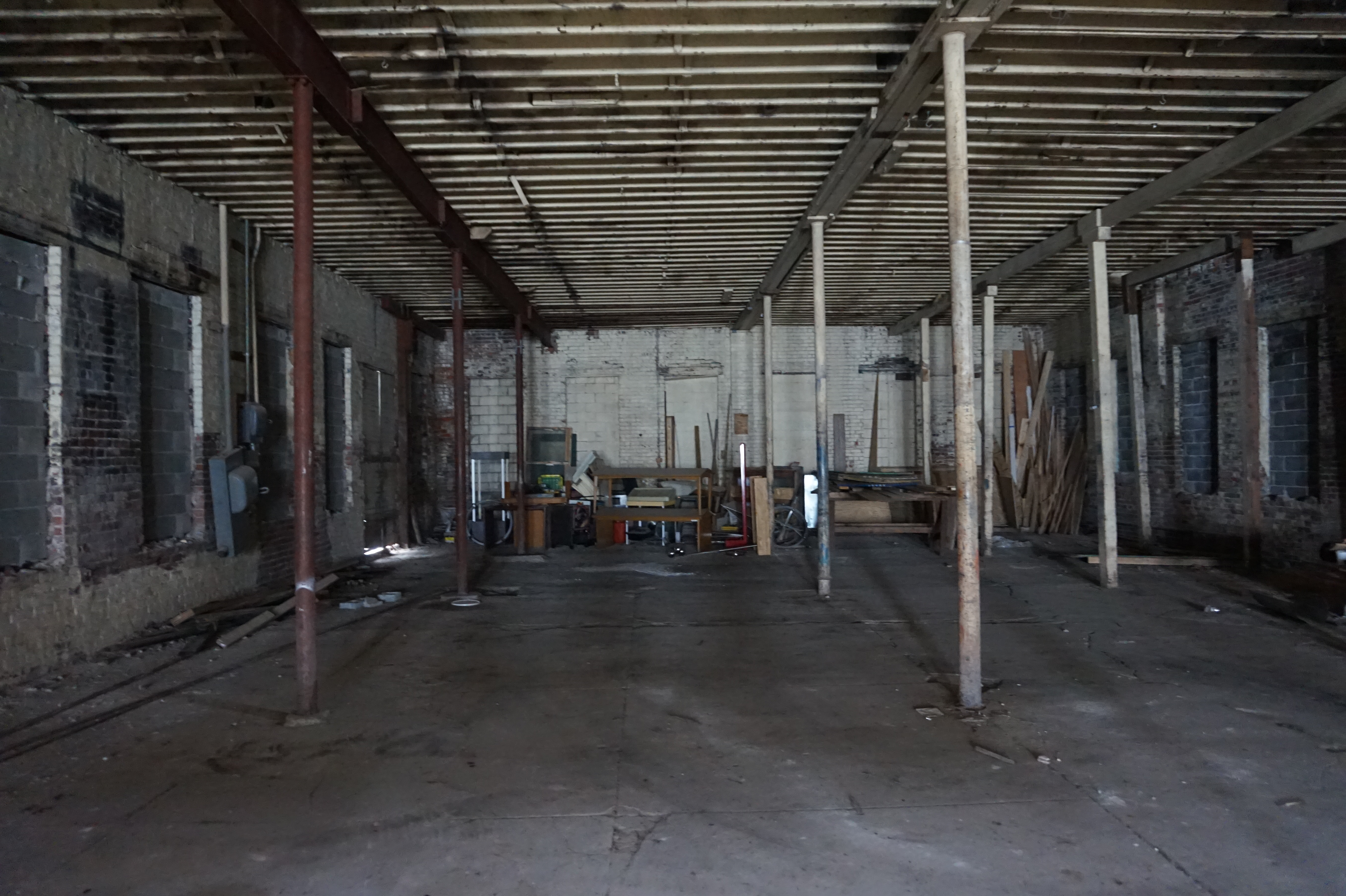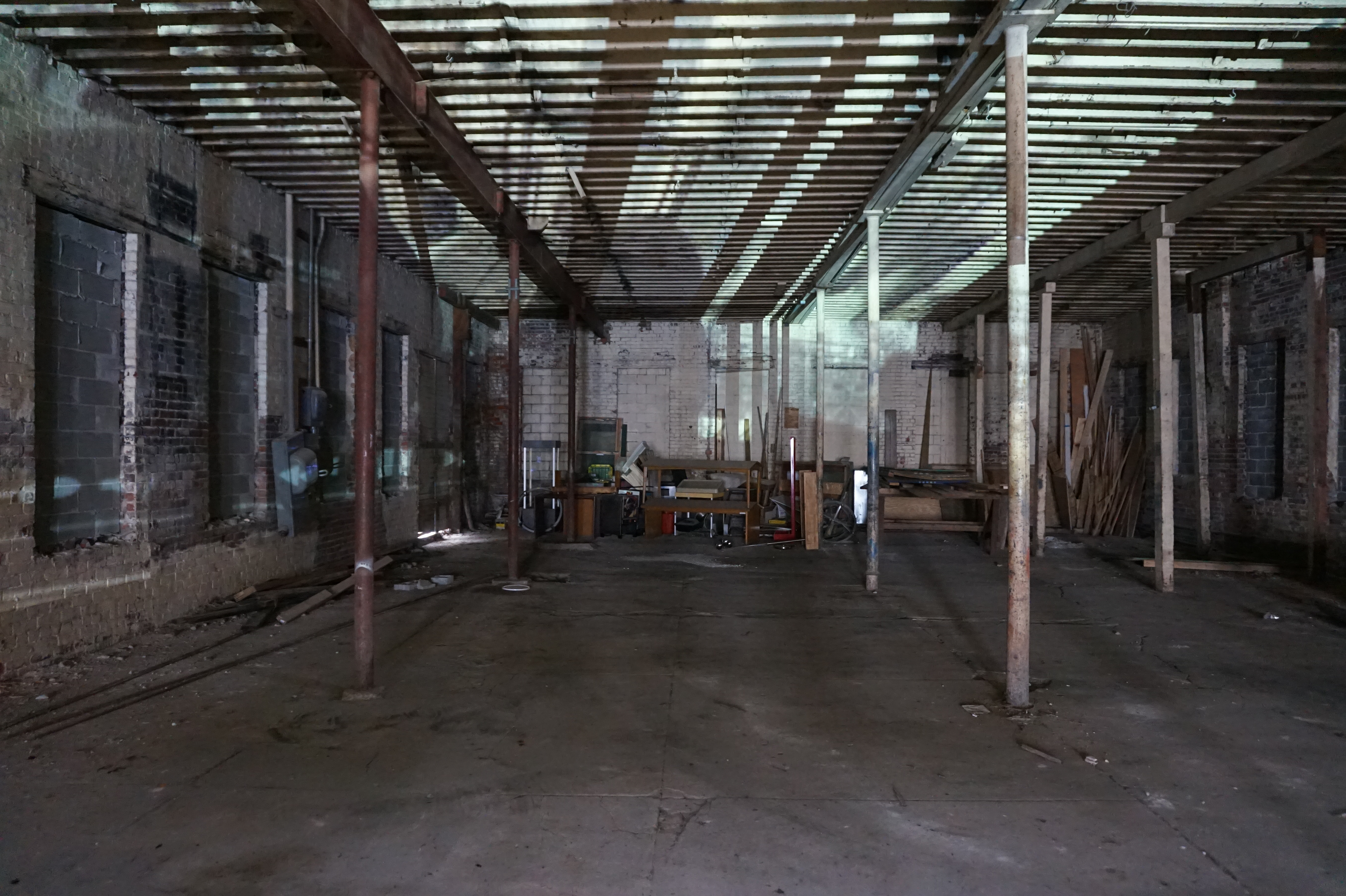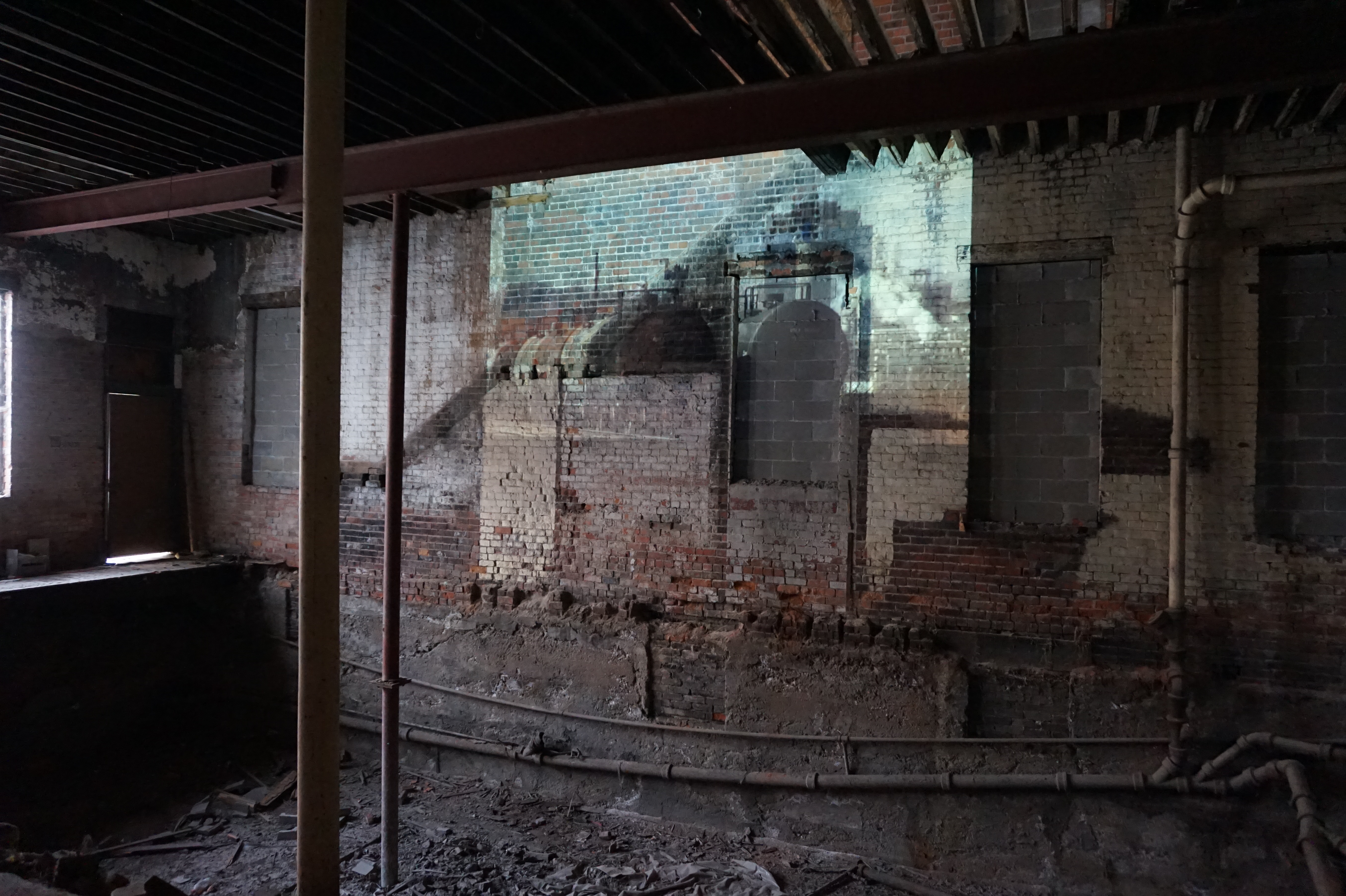 The primary project site in Iowa was the Pitt Carriage Company Building, located in the flood plain at the base of Capitol Hill and in the heart of the East Side of Des Moines. Built in 1909, it is a rare example of an intact carriage works building, made more distinct because it was constructed and operated by Mabel Pitt, the only woman ever to own a carriage company in the United States. The facility served as carriage factory and warehouse until 1934, when the building changed ownership and became, until 1951, an ostrich hatchery. From 1951-1974, it was used as a warehouse for the Feed Specialties Company. Since then, the building has been vacant. The brick structure has a concrete floor, interior wood and steel columns, an array of steel I-beams, wood girders and remnants of wood flooring. Almost all window openings have been filled with concrete masonry units.The lack of light and the diffuse spatial order makes how one perceives (in) the building interior unpredictable. This unpredictability guided the placement and overlay of video footage from Ohio, which was positioned to evoke multiple spatial and imagistic intersections while offering a sense of a consistent assemblage. The compositional whole produced an embodiment of material atmosphere in the absence of environmental control.