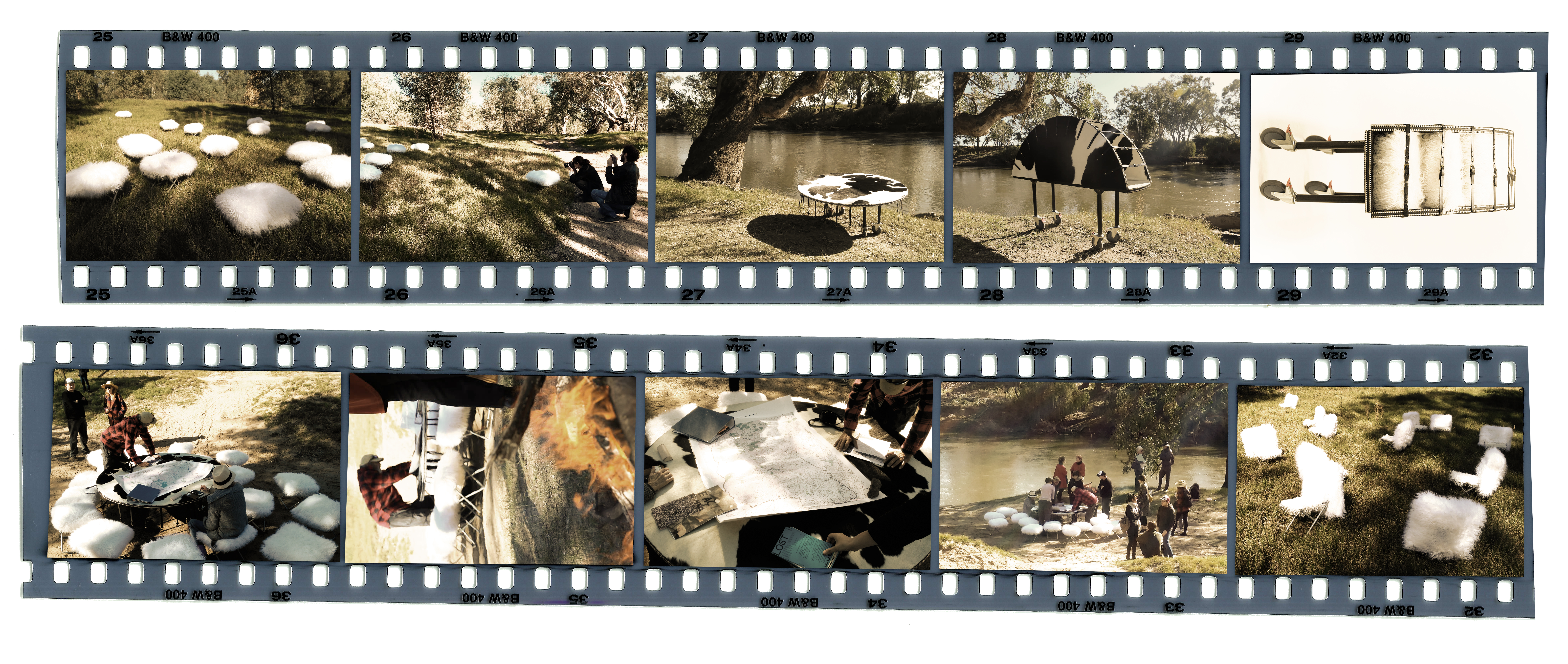 The Merino Chairs belong to a previously unknown chair species that can live both indoors and outdoors. Their skeleton, made of a light, foldable aluminium structure, supports a fluffy body covered by a synthetic sheep-like fur. It is a light and portable creature with a cosy look, and a hybrid specimen at the intersection of two mirrored trading routes. Millions of Australian Merino sheep travel overseas annually, aided by a sophisticated network of technologies for livestock transport,[16] while tons of synthetic sheep-like furs reach Australian ports in shipping containers. If Androids dream of electric sheep, the Merino Chairs graze on surreal landscapes that blur the dichotomy between the pastoral picturesque and the rural techno-aesthetics of a nature-culture continuum in perpetual becoming.